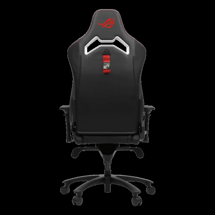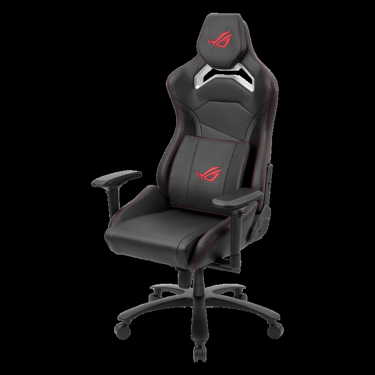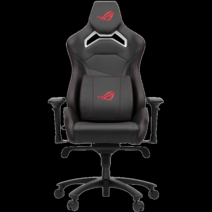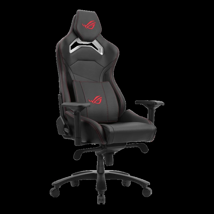 – ROG Chariot X Core gaming chair in racing-car style, featuring an adjustable high-density foam headrest, memory-foam lumbar support, 4D armrests, tilt mechanism, durable class 4 gas lift, and durable premium PU leather for a premium gaming experience.