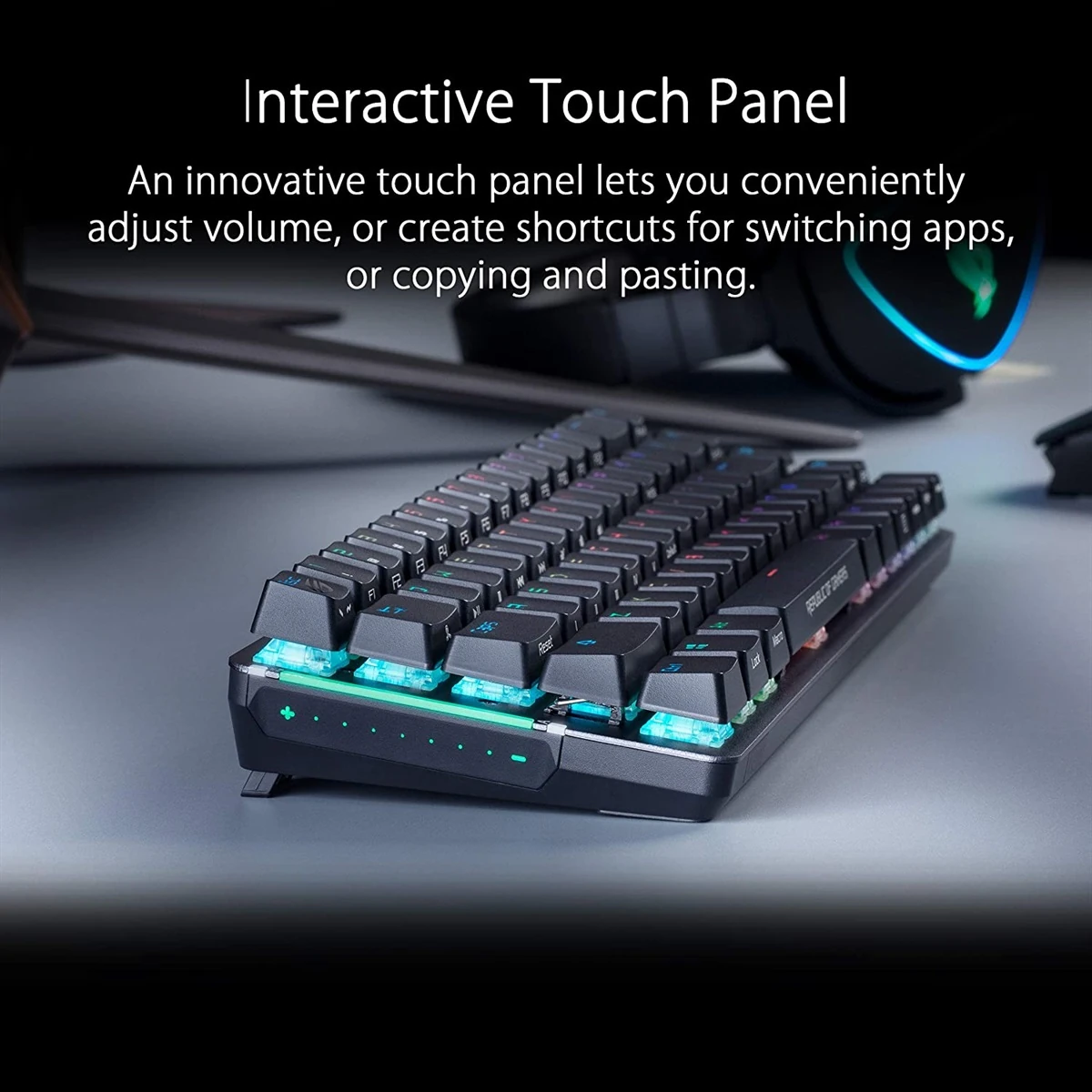 – ROG Falchion NX 65% wireless mechanical gaming keyboard with 68 keys, wireless Aura Sync lighting, interactive touch panel, keyboard cover case, ROG NX switches, and up to 450-hour battery life