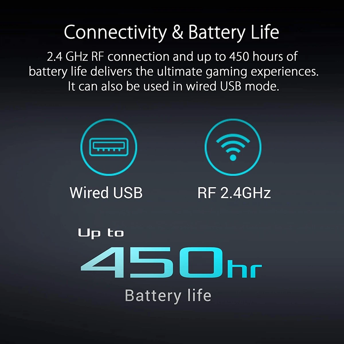– Dual-mode connectivity via wired USB and 1 ms at 2.4 GHz RF, and up to 450 hours of battery life* offer stable, long-lasting performance (*with RGB lighting off)