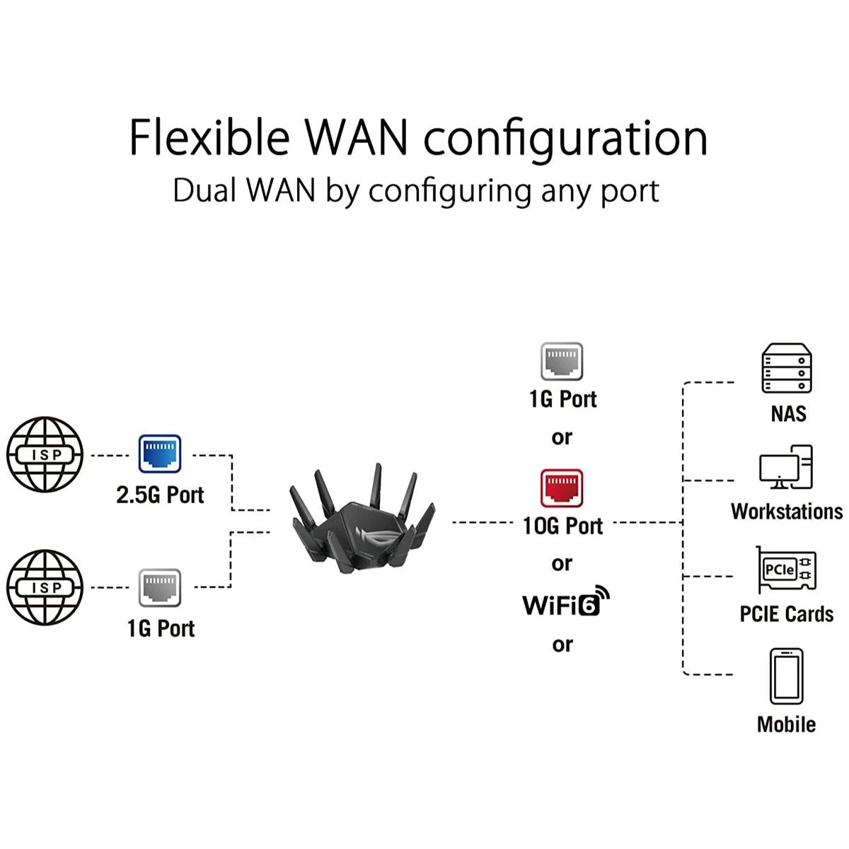 – GT-AXE16000 quad-band WiFi 6E (802.11ax) gaming router, new 6 GHz band, dual 10G ports, 2.5G WAN port, dual WAN, AiMesh support, VPN Fusion, Triple-level game acceleration and free network security
