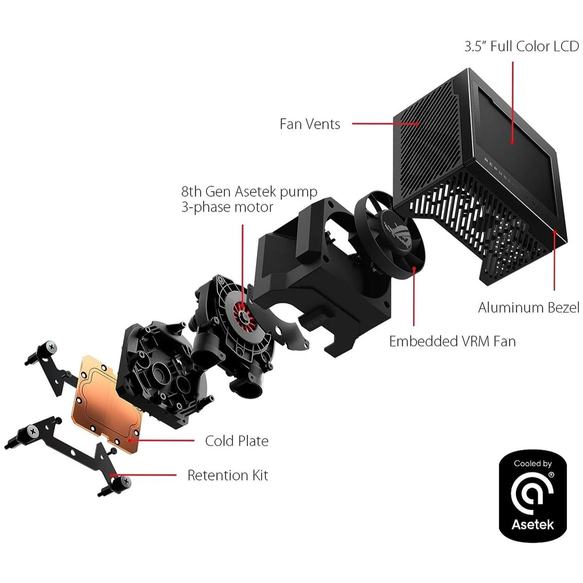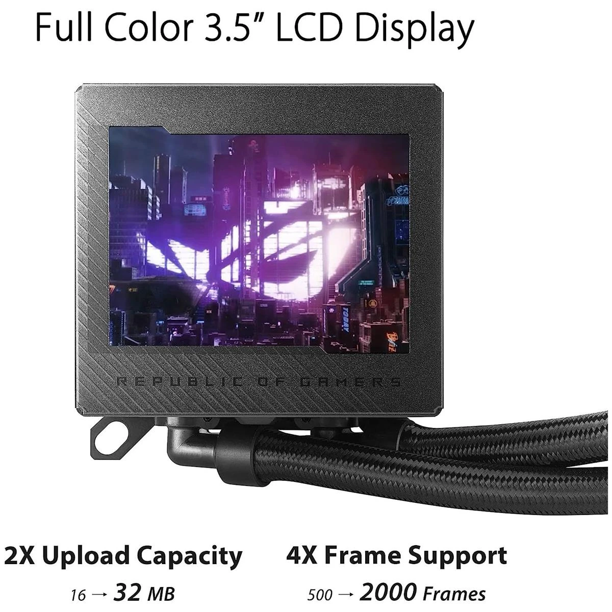 – Go cooler than cool with the Ryujin III. An expansive 3.5-inch LCD screen displays live system stats, animated GIFs, or even your own custom artwork. Underneath, a new 8th Gen Asetek pump quietly, paired with larger coolant tubes, keeps the latest processors from Intel and AMD cool, while an embedded Axial-tech fan helps control motherboard VRM temps. And the coolant within flows through a higher capacity radiator graced with two ROG 120 mm ARGB fans that utilize magnets to make installation a snap.