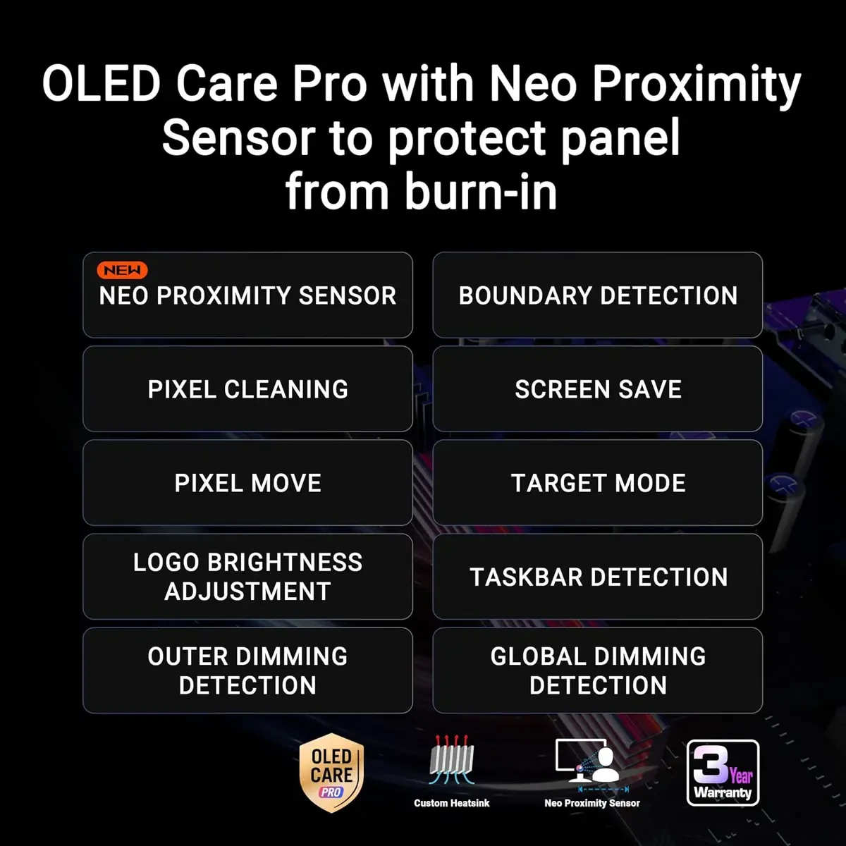 – New ASUS OLED Care Pro functions with Neo Proximity Sensor that precisely detects when the user is away, switching to a black screen to reduce the risk of burn-in