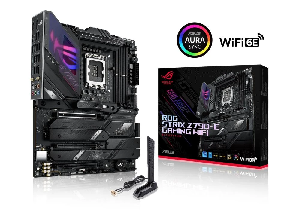 – ASUS ROG Strix Z790-E Gaming WiFi Intel Z790 LGA 1700 ATX motherboard, 18 + 1 power stages, DDR5, five M.2 slots, PCIe 5.0, WiFi 6E, USB 3.2 Gen 2×2 Type-C with PD 3.0 up to 30W, and Aura Sync RGB