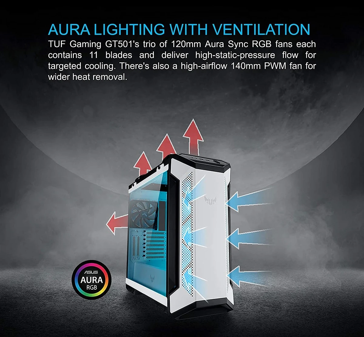 – Efficient cooling: Equipped with three 120mm Aura Sync RGB-illuminated fans and one 140mm rear PWM fan, plus up to seven fan-mounting points for targeted airflow.