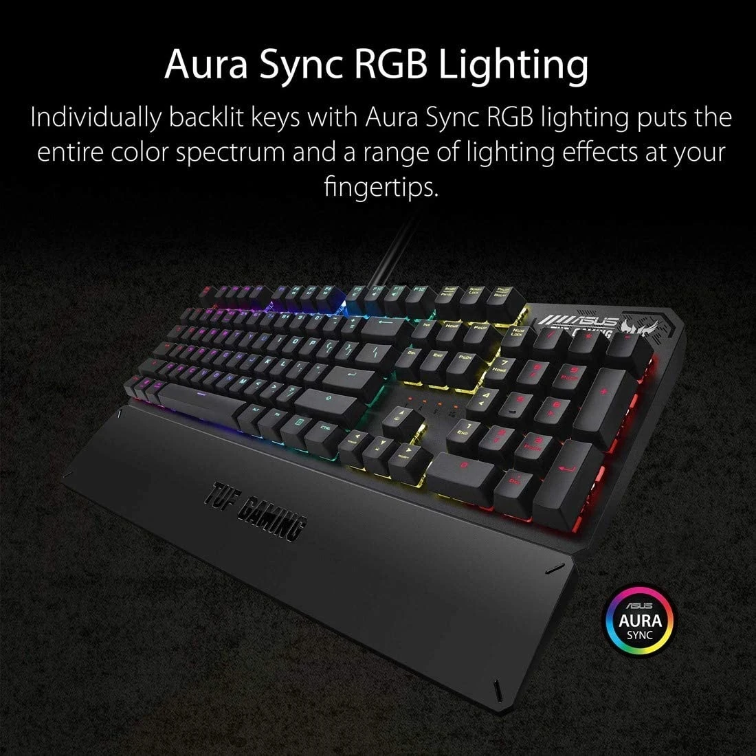 – Individually backlit keys with Aura Sync RGB lighting puts the entire color spectrum and a range of lighting effects at your fingertips, allowing you to tailor your TUF Gaming K3 any way you want. You can even synchronize effects with other Aura Sync-supported devices.