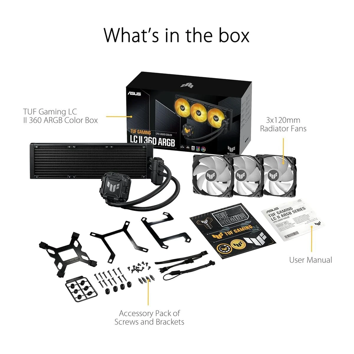 – TUF Gaming LC II 360 ARGB all-in-one CPU liquid coolers with Aura Sync and three TUF Gaming 120mm ARGB radiator fans