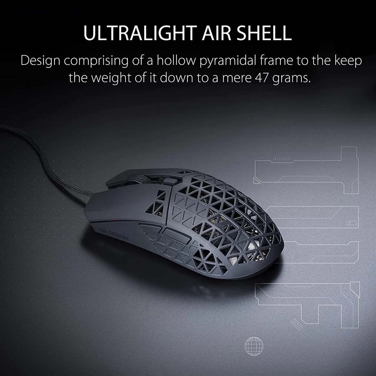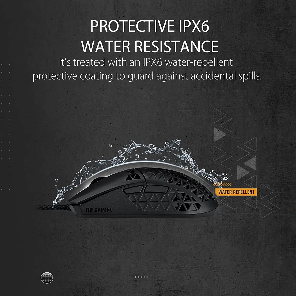 – A lightweight wired gaming mouse with 16,000 dpi sensor, six programmable buttons, ultralight Air Shell,IPX6 water resistance , ASUS Antibacterial Guard, TUF Gaming Paracord and pure PTFE feet.