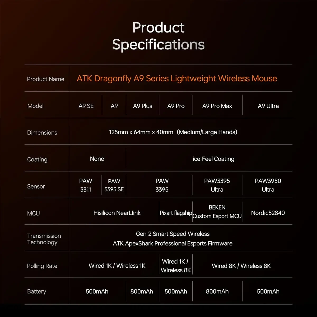 – The ATK Dragonfly A9 Series is designed for gamers with medium to large hands who demand speed, precision, and performance. Crafted with a classic mold, refined with hundreds of enhancements, a durable shell, flagship-level performance, and a smooth ice-feel coating, it provides a one-of-a-kind gaming experience. Whether you’re competing in esports tournaments or handling daily tasks, the ATK Dragonfly A9 guarantees you a best-in-class experience.