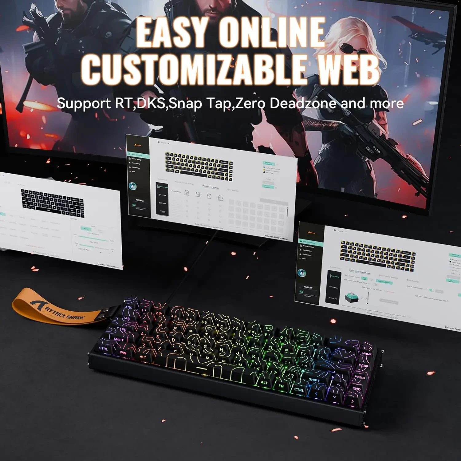 Designed with a 60% compact layout with 68 keys and a chic keyboard ribbon. Its compact form allows for faster mouse movements and improved ergonomics.The X68 MAX HE wired mechanical gaming keyboard is equipped with fully adjustable Hall effect magnetic switches.NOTE:X68Max Support Switch-The entire series of TTC Magneto shafts, TTC King magnetic shafts, Gaote, Jiadalong magnetic jade.
