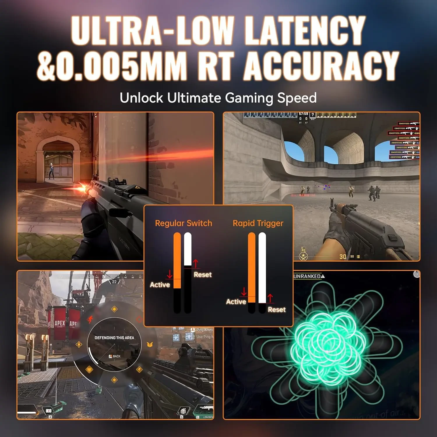 – In Rapid Trigger Mode, the ATTACK SHARK X68 MAX HE effortlessly handles complex manoeuvres with unrivalled speed and precision to stay ahead of the game.With an ultra-low RT step of just 0.005 mm, you can set the touch point of each key from 0.1 mm to 3.4 mm, ultra-precise actuation point defines your one-tap-kill.