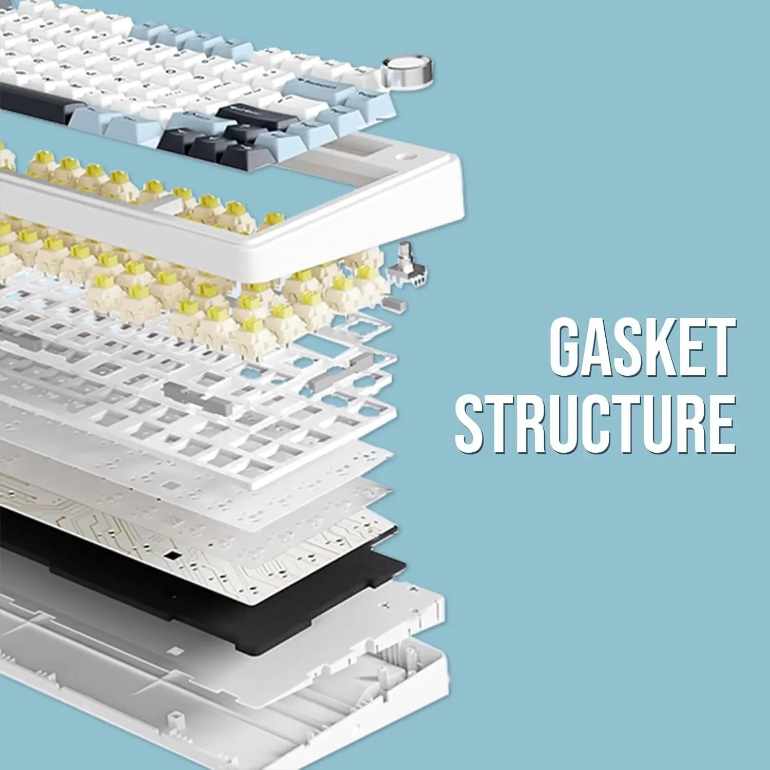 – The F75 boasts a five-layer sound and shock-absorbing internal design, including two layers of Poron foam, an IXPE switch pad, a PET sound enhancement pad, and a bottom silicone pad. This sophisticated construction reduces typing noise and resonance, delivering a tranquil and focused typing environment.