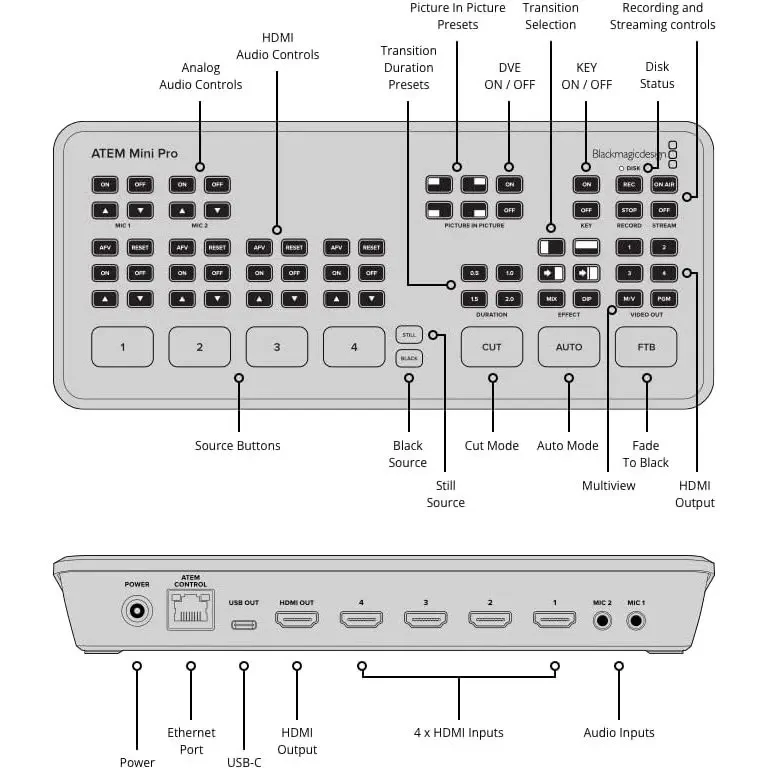 – INCLUDES: ATEM Mini Pro HDMI live stream switcher and external 12V DC power supply with international socket adapters.