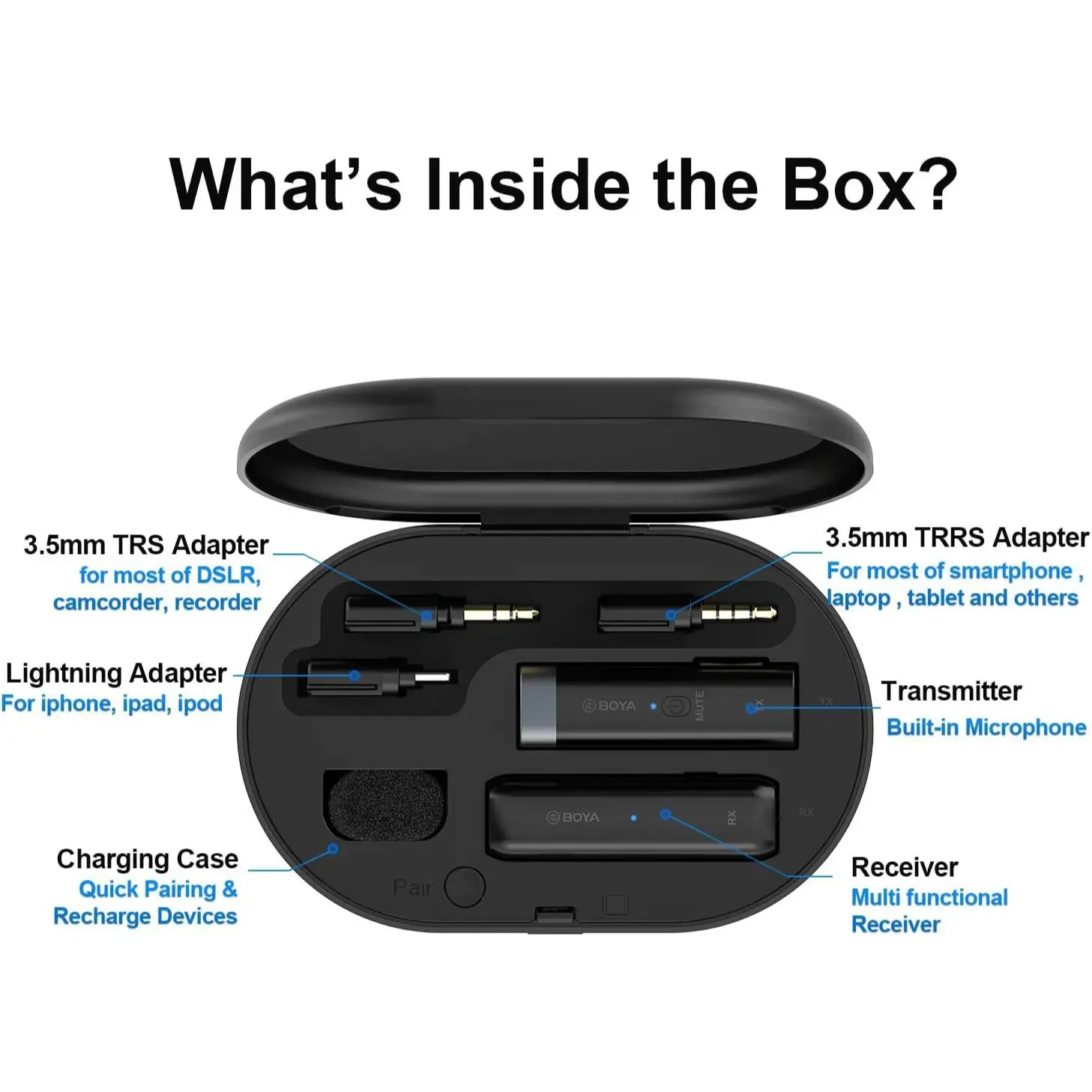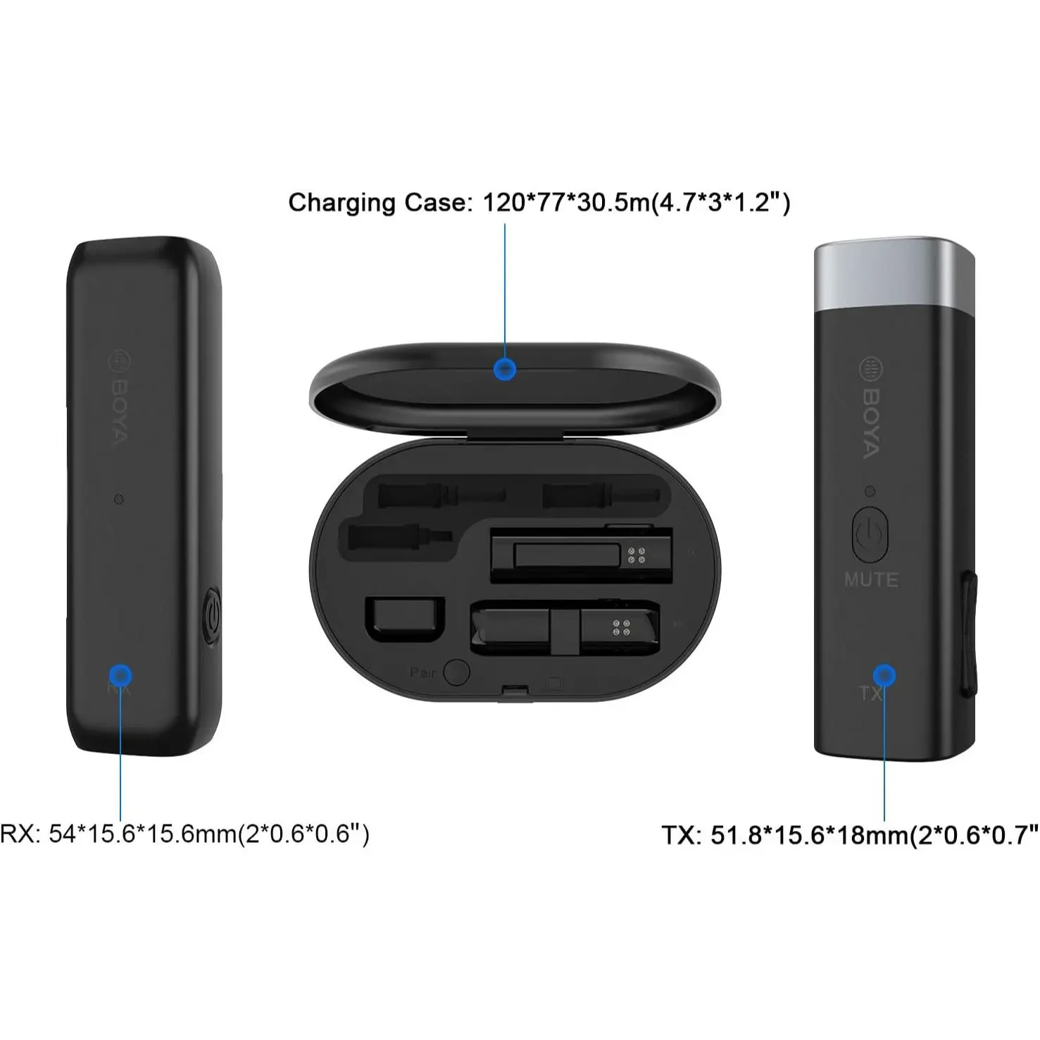 – The charging case can charge the transmitters and receivers anywhere for a longer working time and provide 1000 mAh of charging power, and it’s rechargeable via a USB-C port when its battery runs out.