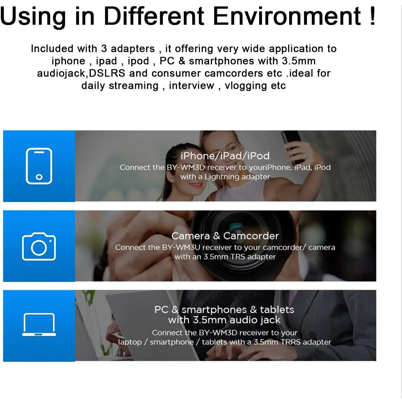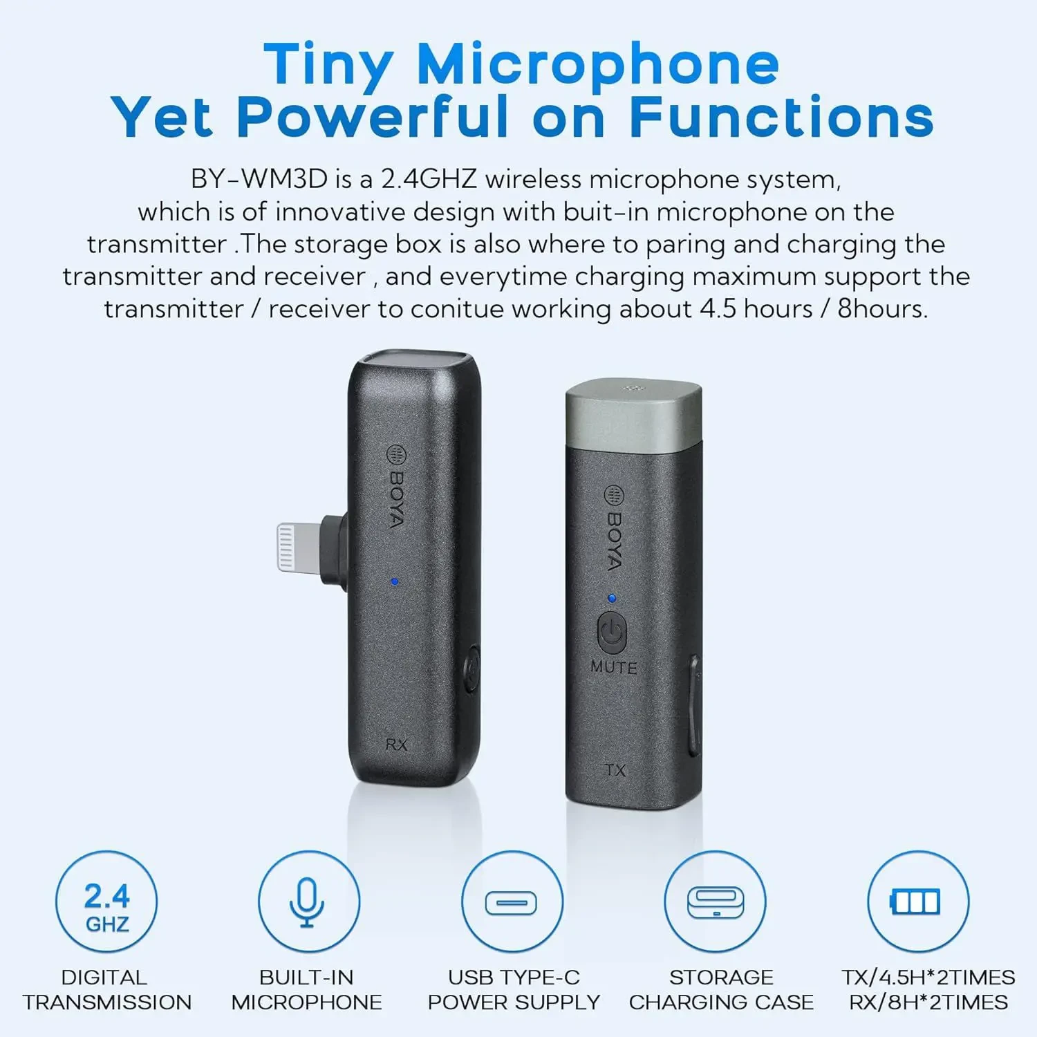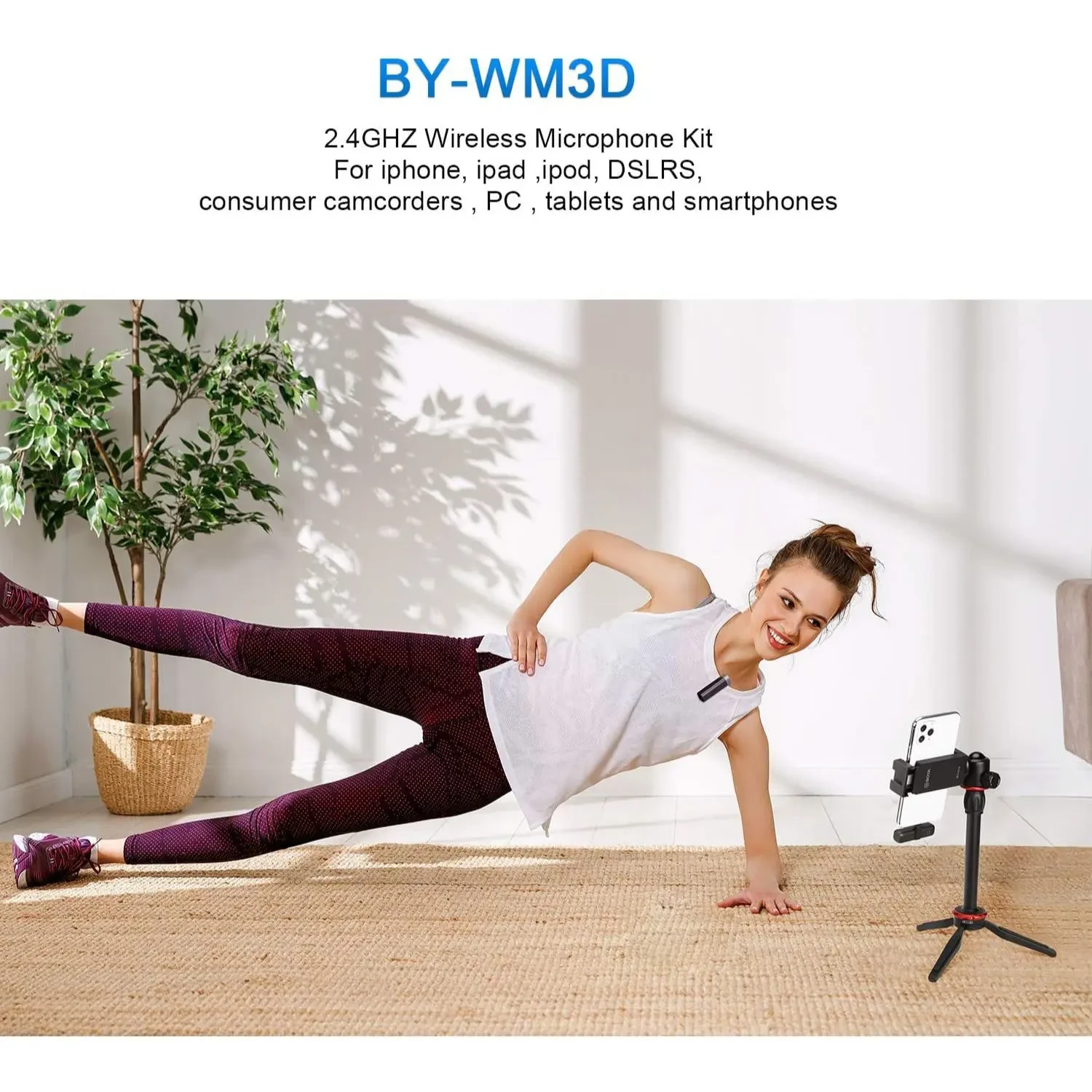 – BY-WM3D is a 2.4GHZ mini wireless microphone system, all-inclusive solution for making it ideal for capturing audio clear, intelligible audio fidelity to your smartphones, tablets, DSLR cameras, consumer camcorders, PCs etc