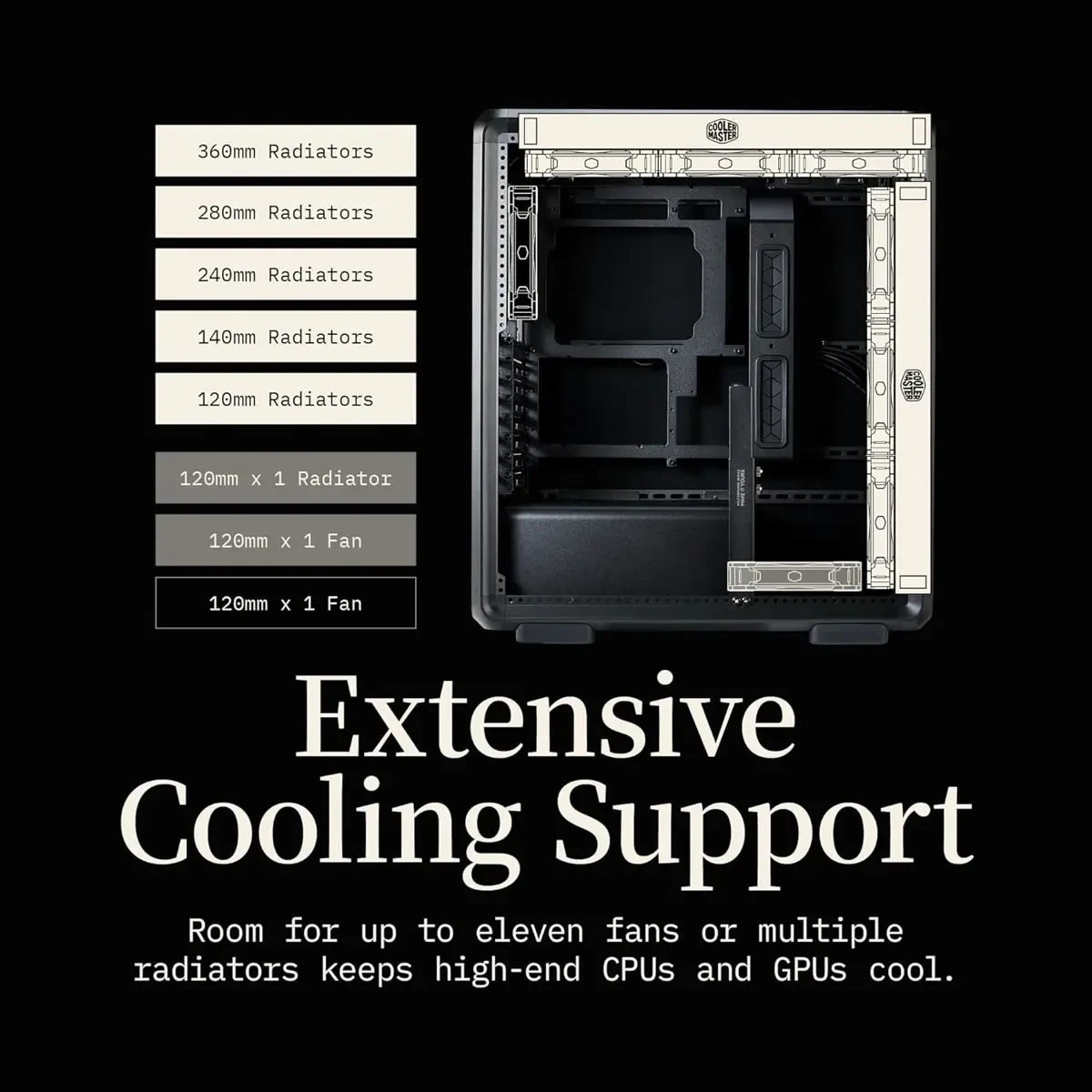 Cooler Master MasterFrame 500 Mesh aRGB Black Freeform 2.0 Modular Platform Open-Air ATX Mid-Tower Case, Aluminum Frame, Dual 200mm aRGB Fans, 390mm GPU Max, 360mm AIO Max, Type C, Tempered Glass is designed for buyers who want dependable performance with a clean upgrade path.