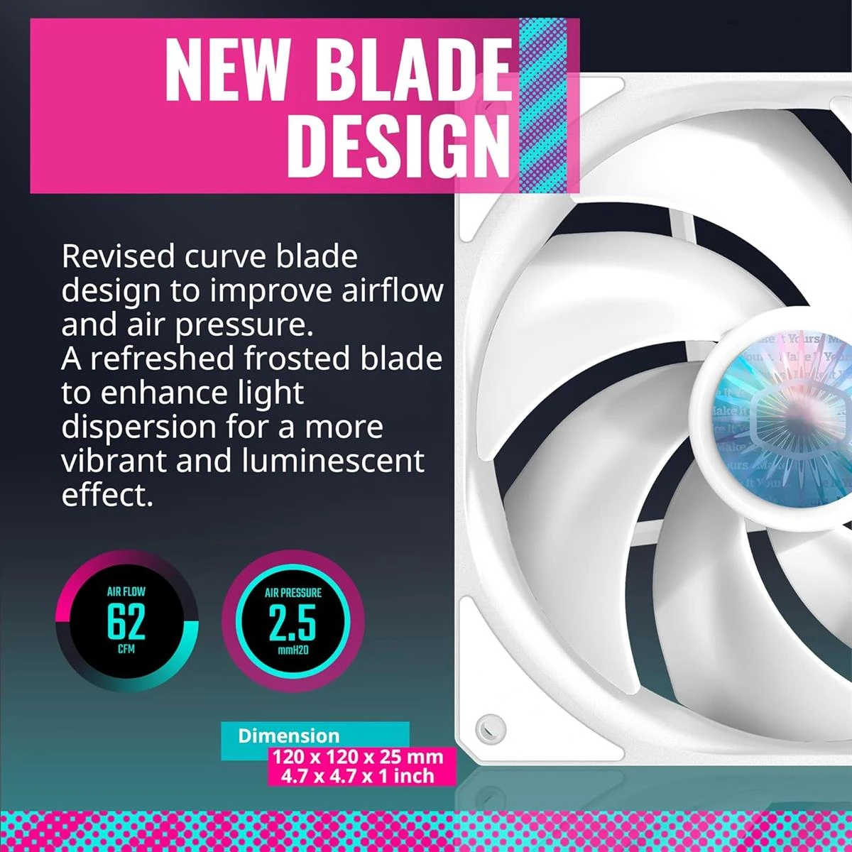 Cooler Master SickleFlow 120 ARGB White Edition 3in1 Case Cooling Fans, 3x 120 mm Fans, Controller Included, ARGB Motherboard Compatible, White Air Balance Blades, 62 CFM, 2.5 mmH2O, 8 to 27 dBA- ARGB is designed for buyers who want dependable performance with a clean upgrade path.