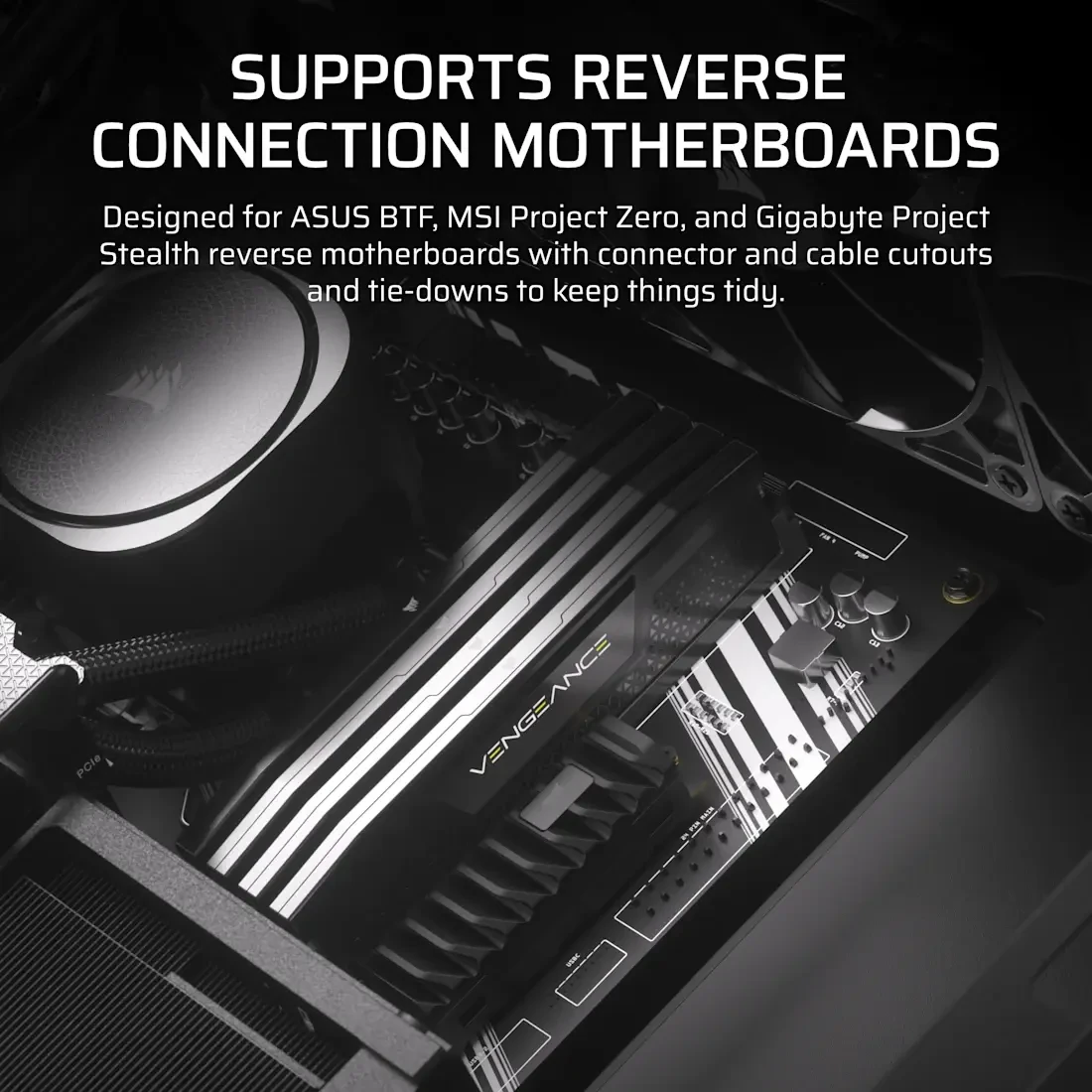 – The CORSAIR FRAME 4000D RS is a fully-modular and spacious mid-tower PC case featuring InfiniRail™ Fan Mounting System and compatible with reverse connector motherboards.