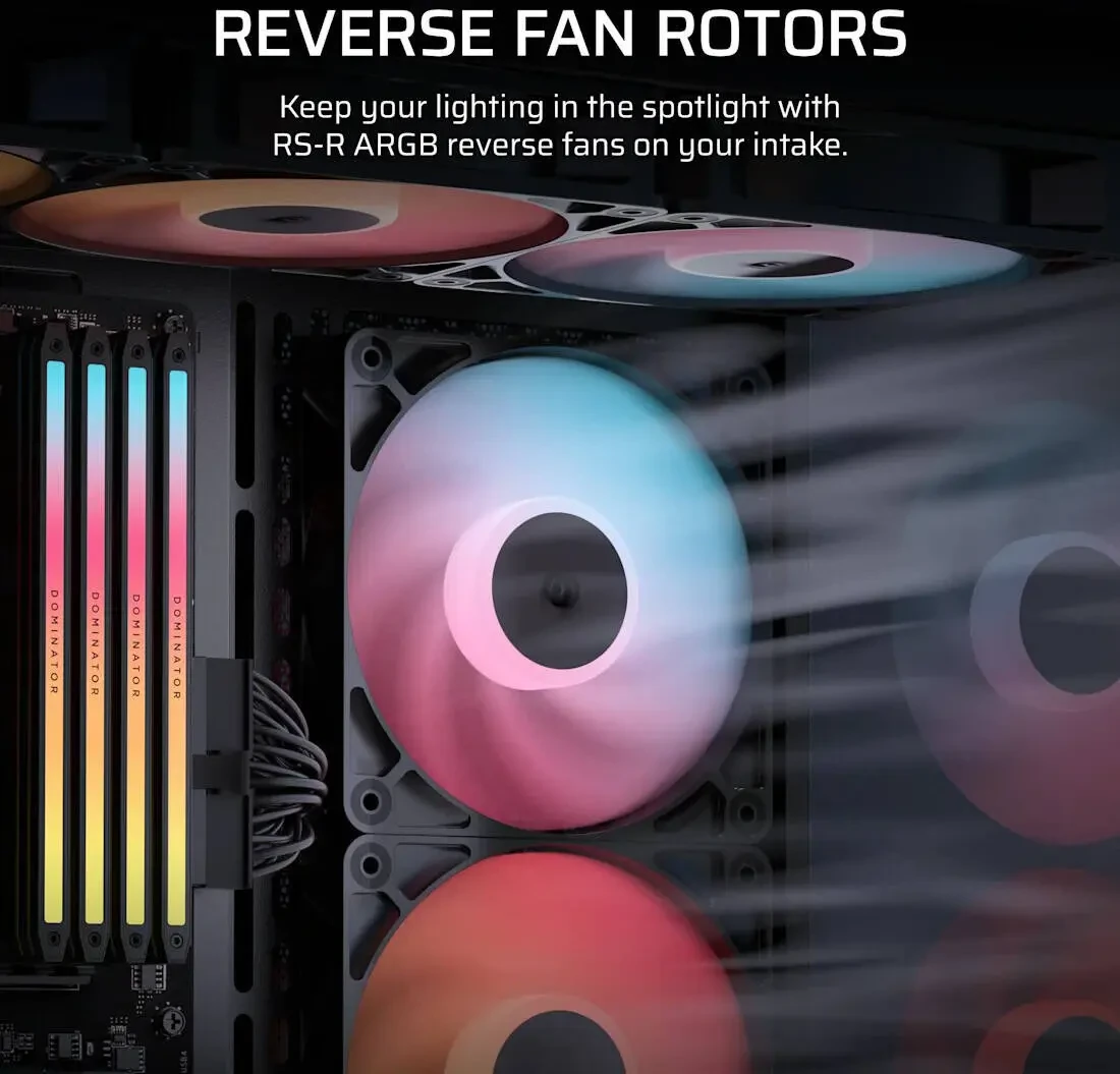 – Delivering vibrant RGB lighting with a flawless aesthetic, CORSAIR RS120-R ARGB Fans feature reverse rotors, making them ideal intake fans with easy daisy-chain 4-pin PWM and +5V ARGB motherboard control.