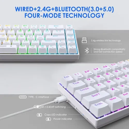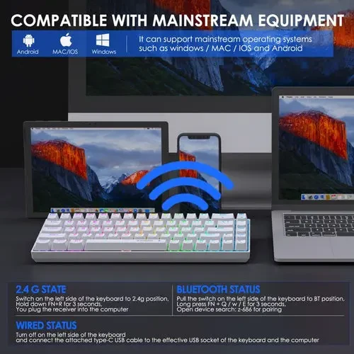 E-Yooso Z686 Tri-Mode Wireless Gaming Keyboard – 68 Keys, (BT/2.4G/USB) Type-C Wired, Mechanical Keyboard, Lightweight, Anti-Ghosting, Double Shot Keycaps, Hot-swappable, RGB Backlight, Blue Switch, White is designed for buyers who want dependable performance with a clean upgrade path.