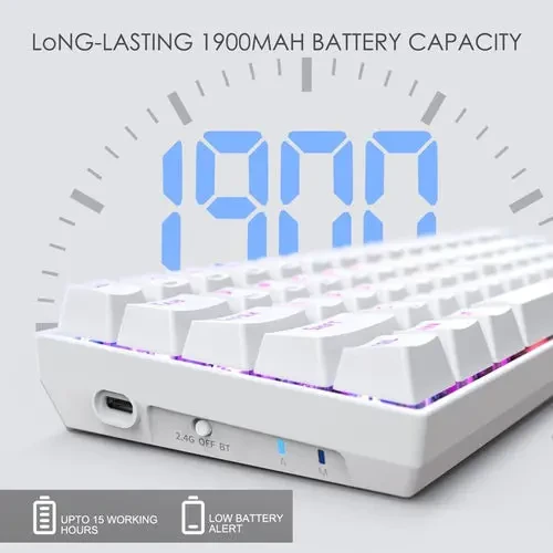 5. 1900mAh battery and ergonomic design: The 1900mAh battery allows you to use it continuously for about 12 hours with the lightest backlight. (The battery will be different for different occasions.) The important thing is that the keyboard also has the function of automatic sleep and low battery indicator. The gaming keyboard adopts a scientific stepped keycap design to bring maximum comfort, keep your hands in the most natural state, reduce hand fatigue after long-term use, and help you reduce typing errors.
