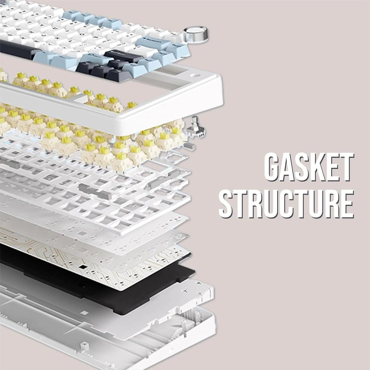 – The F75 boasts a five-layer sound and shock-absorbing internal design, including two layers of Poron foam, an IXPE switch pad, a PET sound enhancement pad, and a bottom silicone pad. This sophisticated construction reduces typing noise and resonance, delivering a tranquil and focused typing environment.