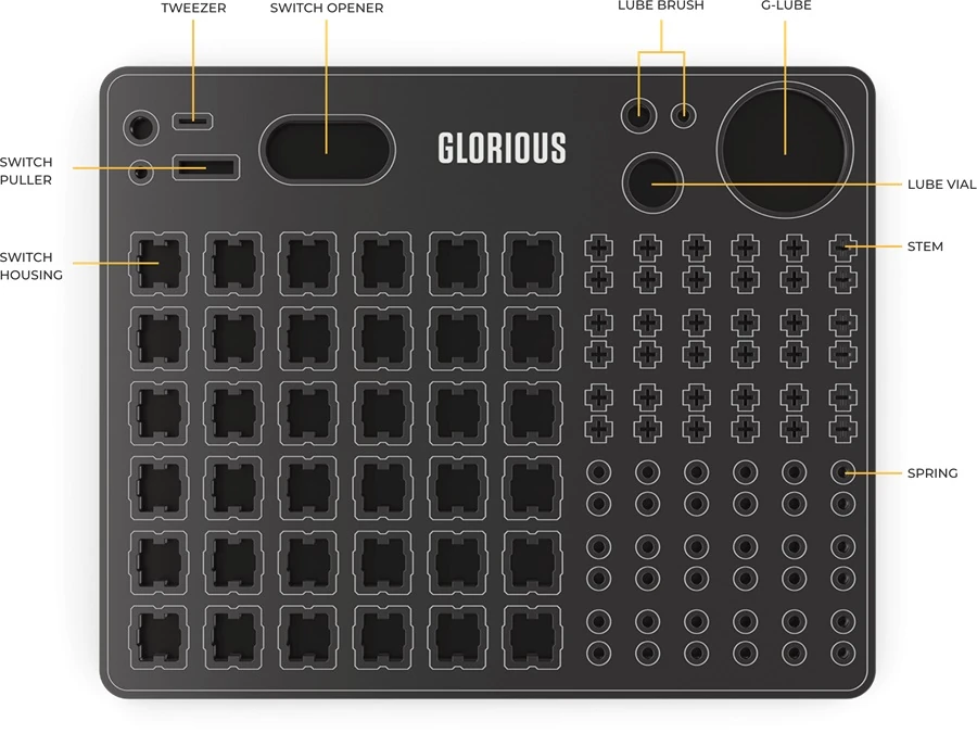 – Holds up to 36 mechanical keyboard switch springs, stems, and housings in perfect position for maximum lubing efficiency. With a stylish, compact acrylic body and 9 additional slots for all of your lubing accessories, keeping your workstation in order has never been easier. You’ll be able to apply lube faster, and never lose parts again!