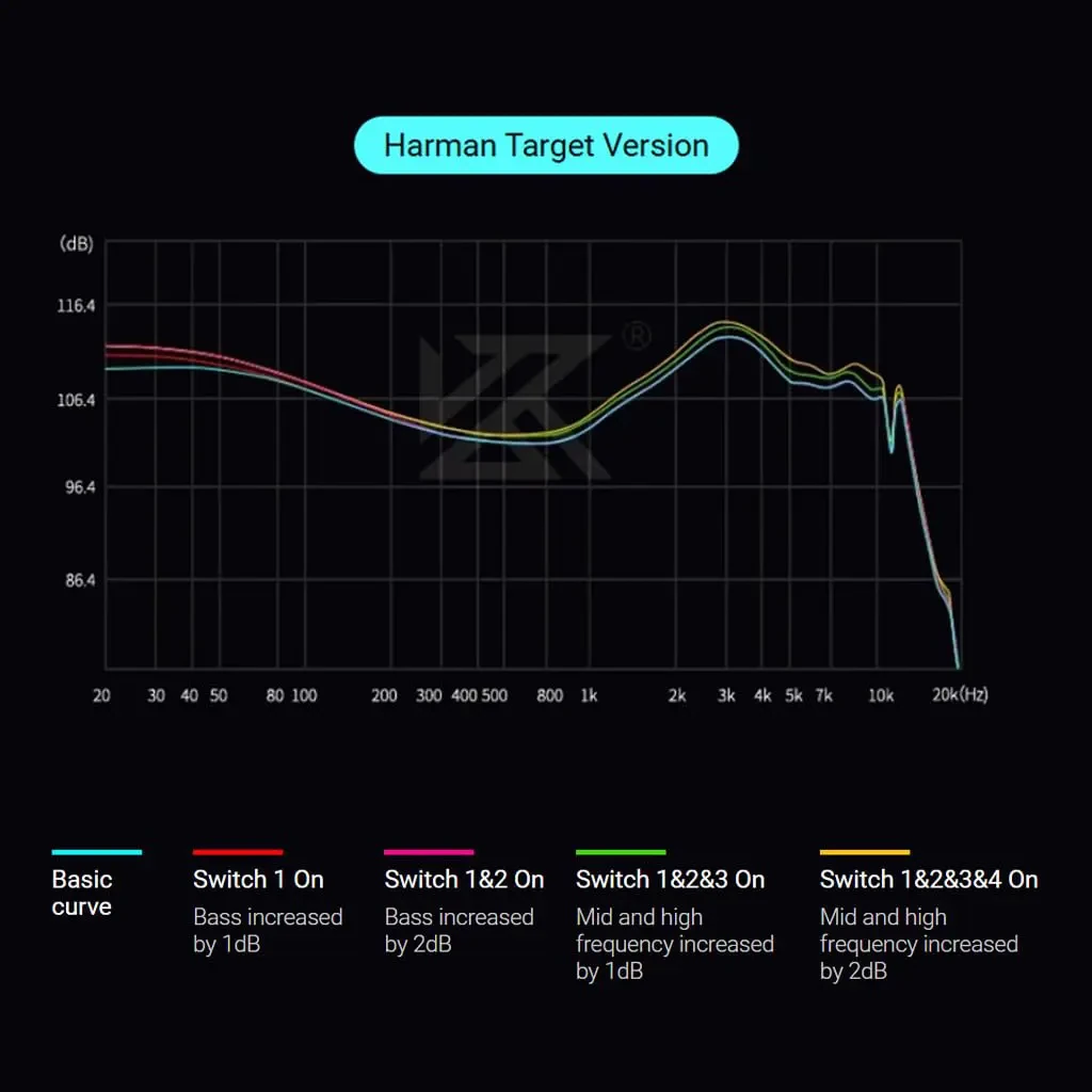 Designed for those who love deeper, more resonant lows, this version offers: Switch 1 On (Bass +1dB) | Switch 1&2 On (Bass +2dB) | Switch 3 On (Mid & High +1dB) | Switch 3&4 On (Mid & High +2dB). The Harman Curve Bass-Enhanced version boosts sensitivity and dynamic low-frequency performance while maintaining the Harman curve’s clarity in mid and high frequencies for a substantial overall sound quality improvement.