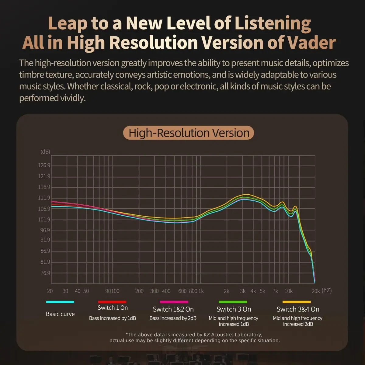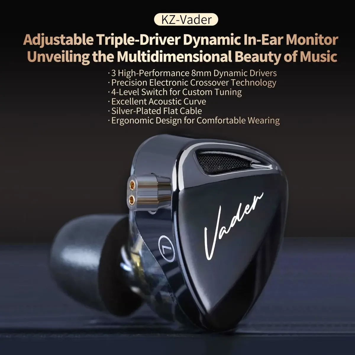 – KZ Vader HiFi earbuds use a brand-new electronic crossover technology, allowing for independent and precise output control of different sound frequency ranges, including bass, mid and treble, each frequency range is exactly reproduced and presented.