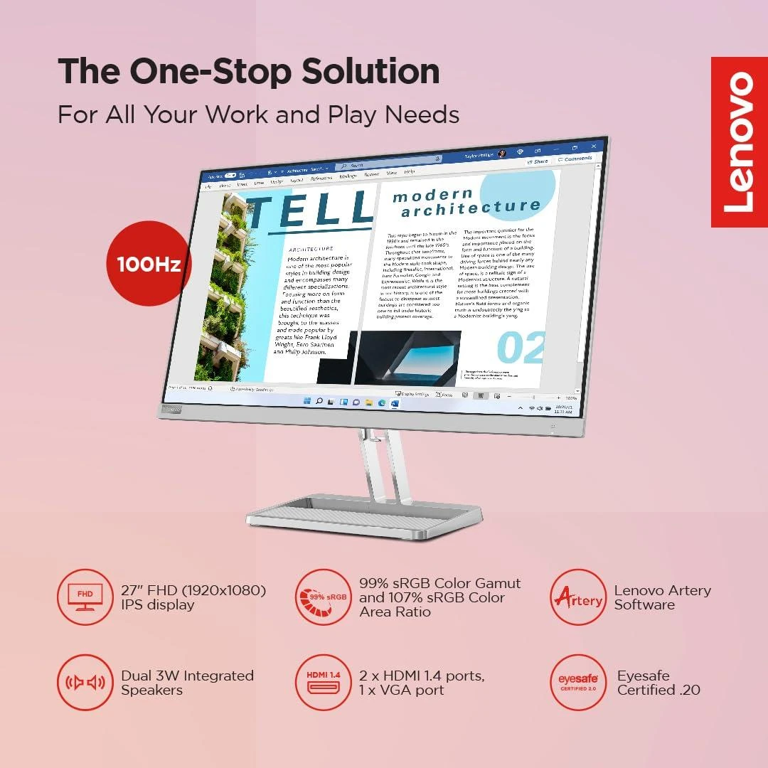– The Lenovo L27i-40 Monitor is the perfect blend of form and function. Its 27-inch screen provides enough real estate to comfortably view two windows side by side. The In-Plane Switching panel?s wide viewing angle ensures that anyone viewing the screen from any perspective sees a consistent image. Slim bezels and a metal stand give the monitor a very contemporary look that goes with any modern desk setup. The In-Plane Switching panel, combined with a 107% sRGB color area ratio and a 99% sRGB color gamut ensures that each shade is reproduced as it was originally created. Its 100 Hz? refresh rate and imperceptible 4ms response time2 ensure that you?re always on top of your game. Two 3W speakers provide rich, stereo sound, giving you the freedom to attend your video meetings and lectures without having to use any earphones or headphones. Along with it,the monitor?s audio-out port also gives you the flexibility to connect additional audio gear, if you prefer. Its two HDMI 1.4 and a VGA port give you a variety of connectivity options. The stand?s tilt functionality ensures the monitor makes all the adjustments to keep you comfortable. You could also VESA Mount the monitor for a different perspective. Lenovo?s Artery Software3 gives you an extremely high level of customizability, allowing you to tailor your viewing experience precisely to your needs. Additionally, the cable management feature, coupled with the in-built phone stand allows you to keep your desk completely clean. The Lenovo L27i-40 Monitor is simply the perfect addition to a minimal, contemporary, and productivity-driven setup!