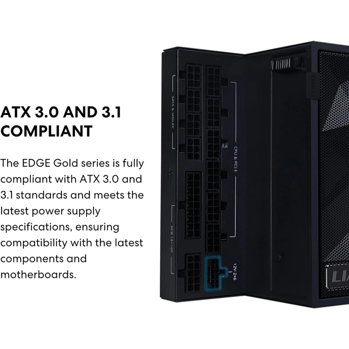 Lian Li Edge Gold 850W Full Modular Power Supply: ATX 3.1, PCIe 5.1 Support, 12V-2x6 Connector, L-Shape Design for Dual Chamer Case, Without USB/Fan Hub - White