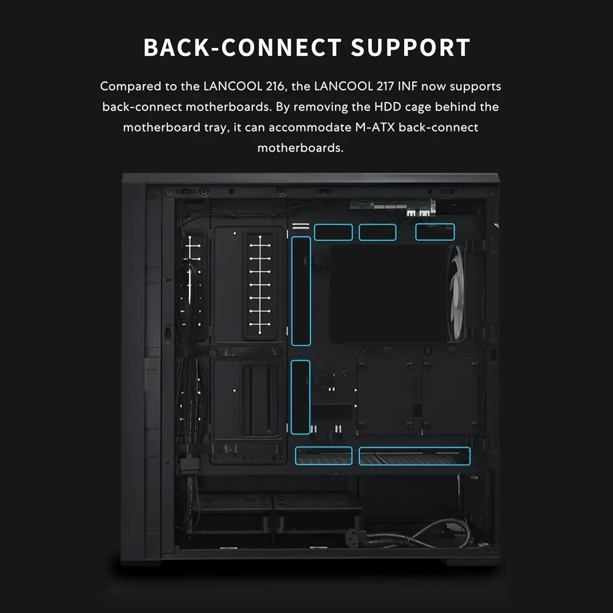 – Elevate Your Build: Experience effortless lighting control with the LANCOOL 217 INFX, featuring seamless synchronization via motherboard software or wireless control for a stunning display.