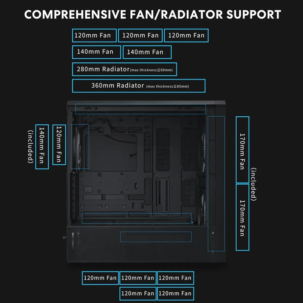 – Three Pre-Installed Fans: Comes with three ARGB fans (two 170mm at the front and one 140mm at the rear) that not only enhance system cooling but also elevate the case’s visual appeal with dynamic lighting effects.