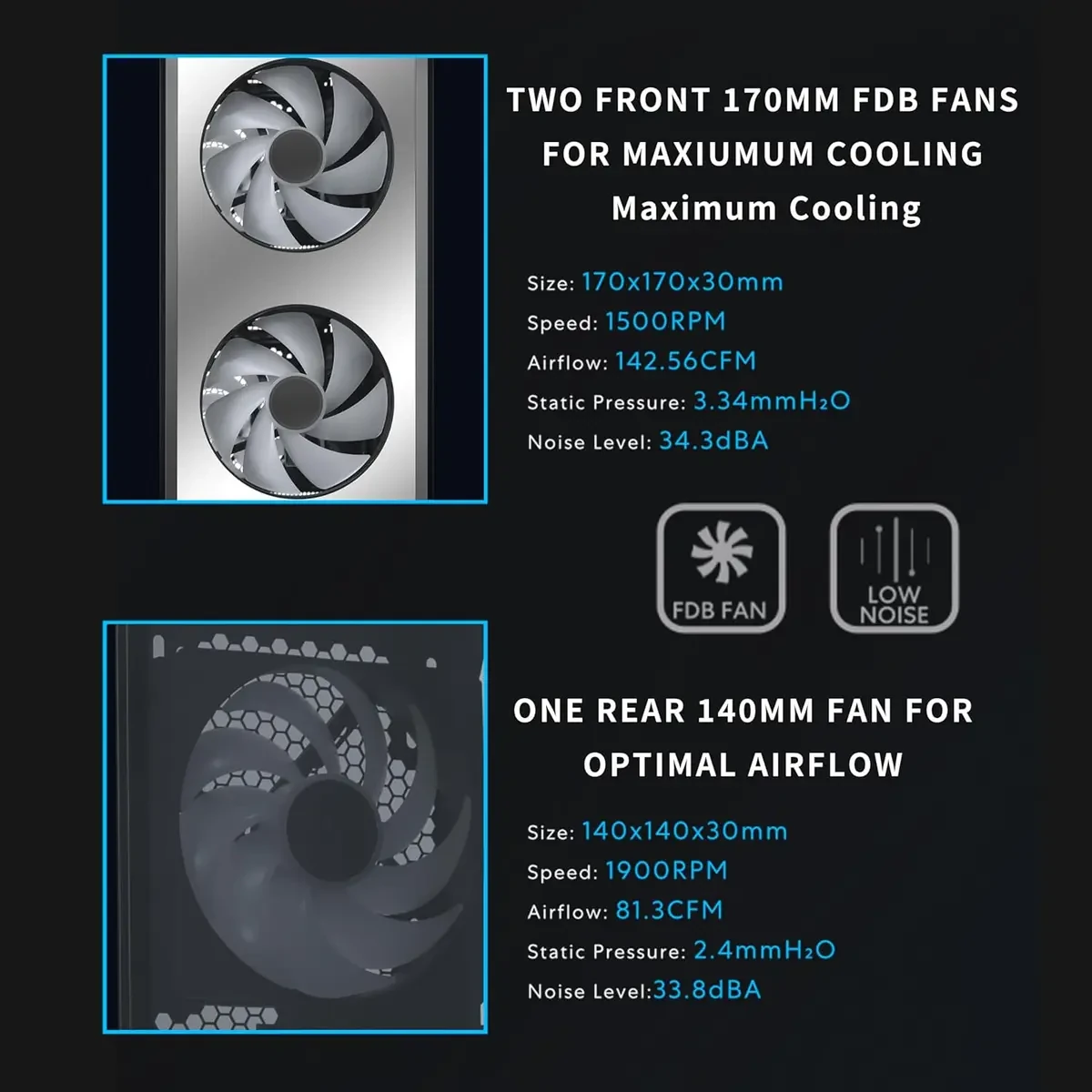 Three Pre-Installed Fans: Comes with three ARGB fans (two 170mm at the front and one 140mm at the rear) that not only enhance system cooling but also elevate the case’s visual appeal with dynamic lighting effects.