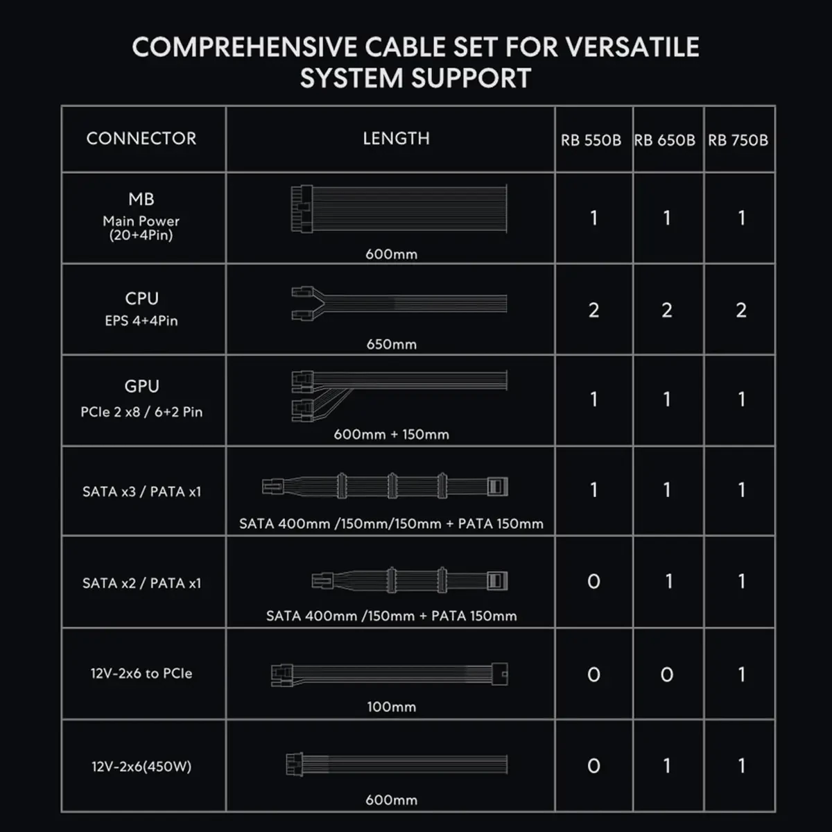 80 PLUS Bronze Certification: The RB Series power supply is 80 PLUS Bronze certified, delivering up to 85% efficiency at typical loads. This certification minimizes energy waste and heat production, resulting in lower electricity bills while ensuring dependable performance.