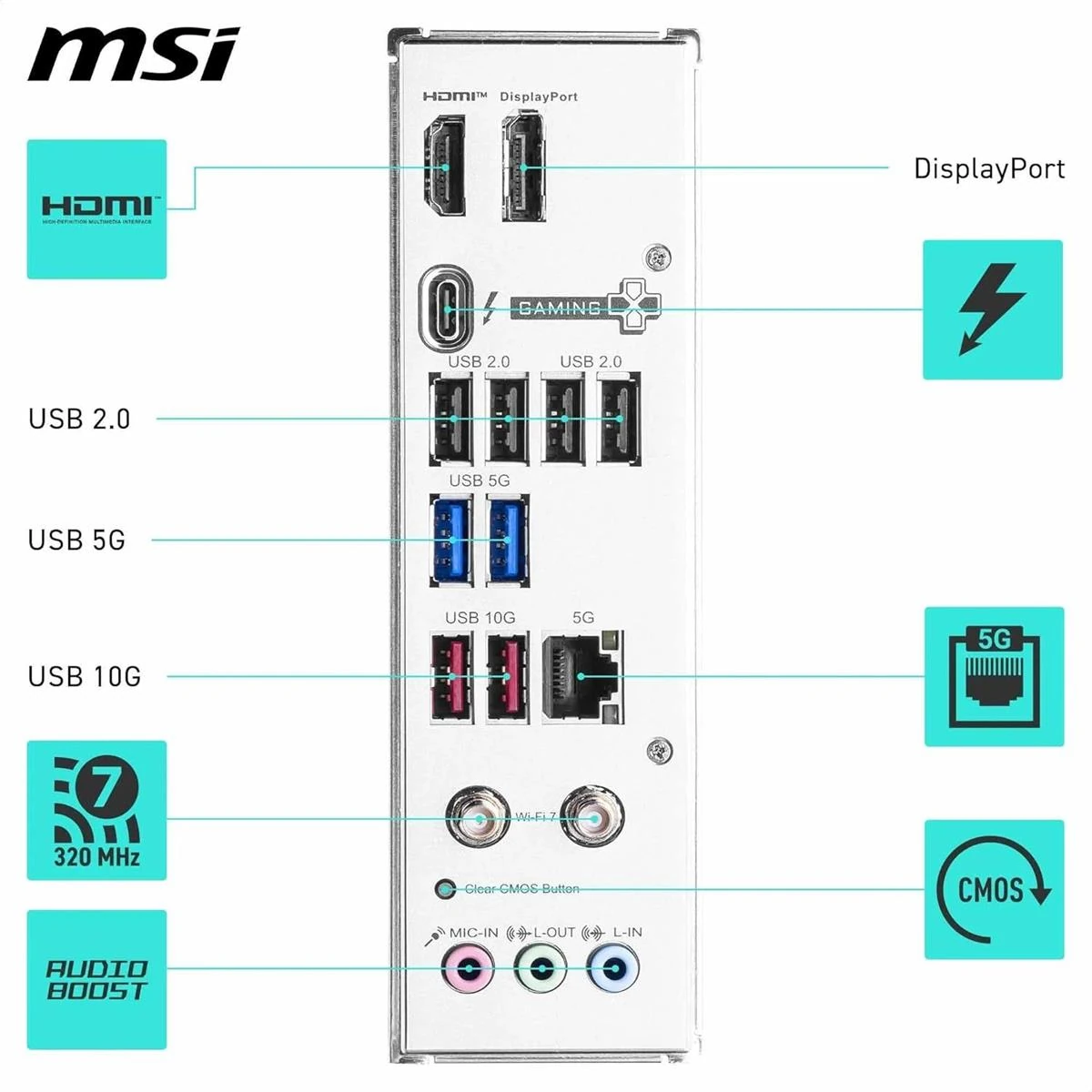 Ultra Connect: Thunderbolt 4 Type-C, Intel Killer 5G LAN, Full-speed Wi-Fi 7 solution, Bluetooth 5.4