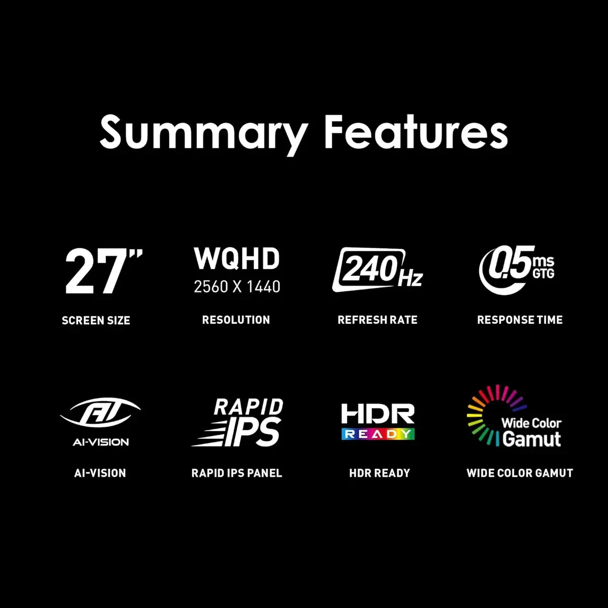 – Rapid IPS Panel – Provides 0.5ms (GtG, Min.) response time, optimizes screen colors and brightness.
