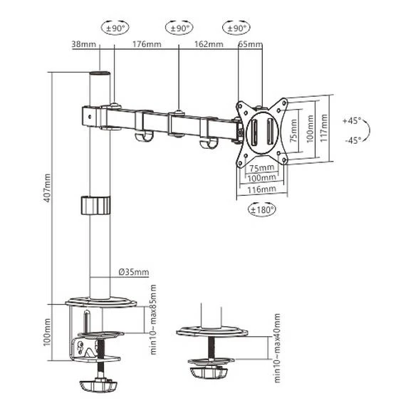 – With a durable steel structure, the BMA-12P provides stable support for a single 17” to 32” monitor up to 9kg(19.8lbs). Flexible design for ample adjustment and viewing angles, adjustable for either portrait or landscape orientation. Grommet and clamp mounting options included for installation on most any work surface. A detachable VESA plate for user-friendly installation. Cable clips included for an organized and clutter-free workplace.