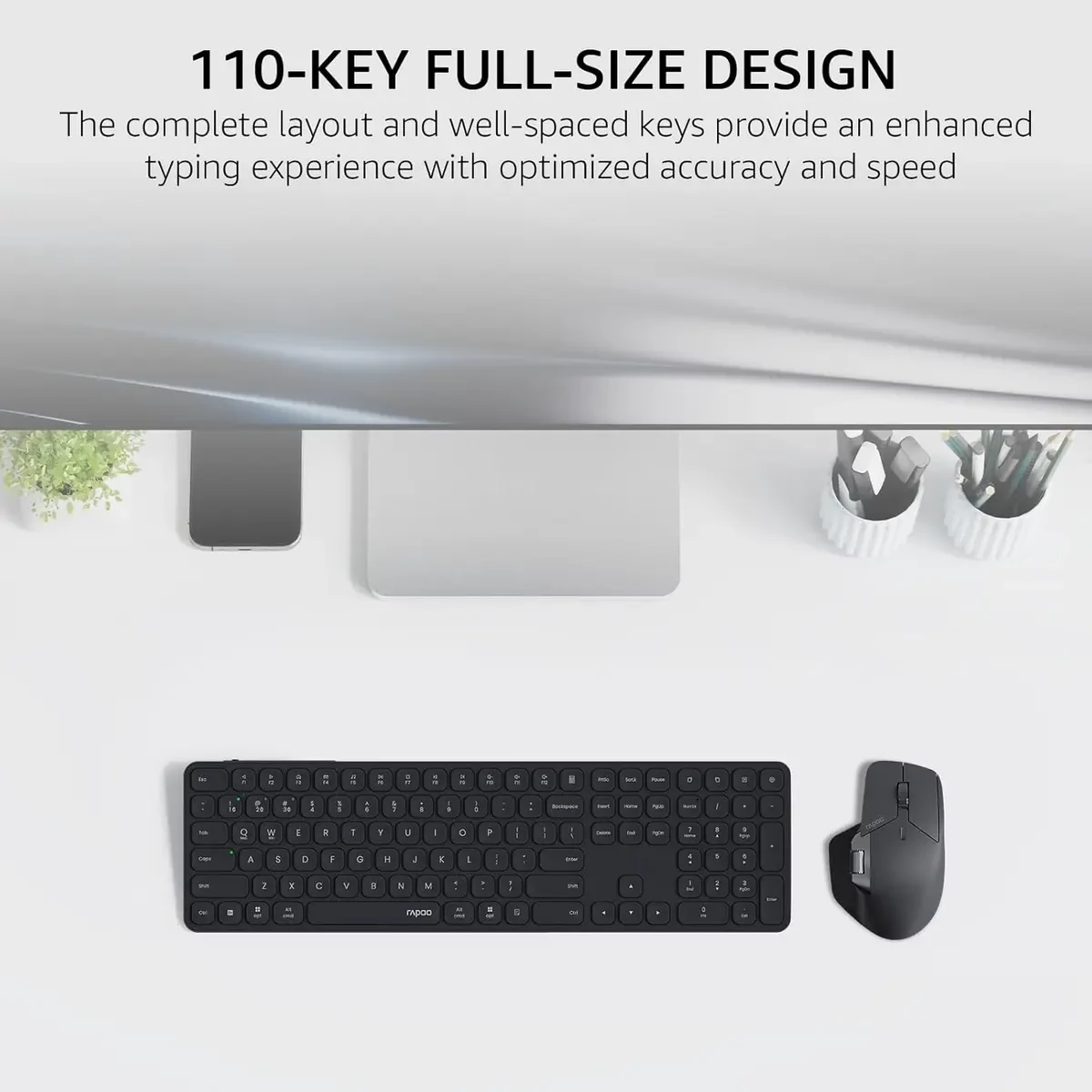– Full-Size Ultra-Slim Keyboard: 110-key layout with scissor chiclet keys and multimedia hotkeys for comfortable, quiet typing.