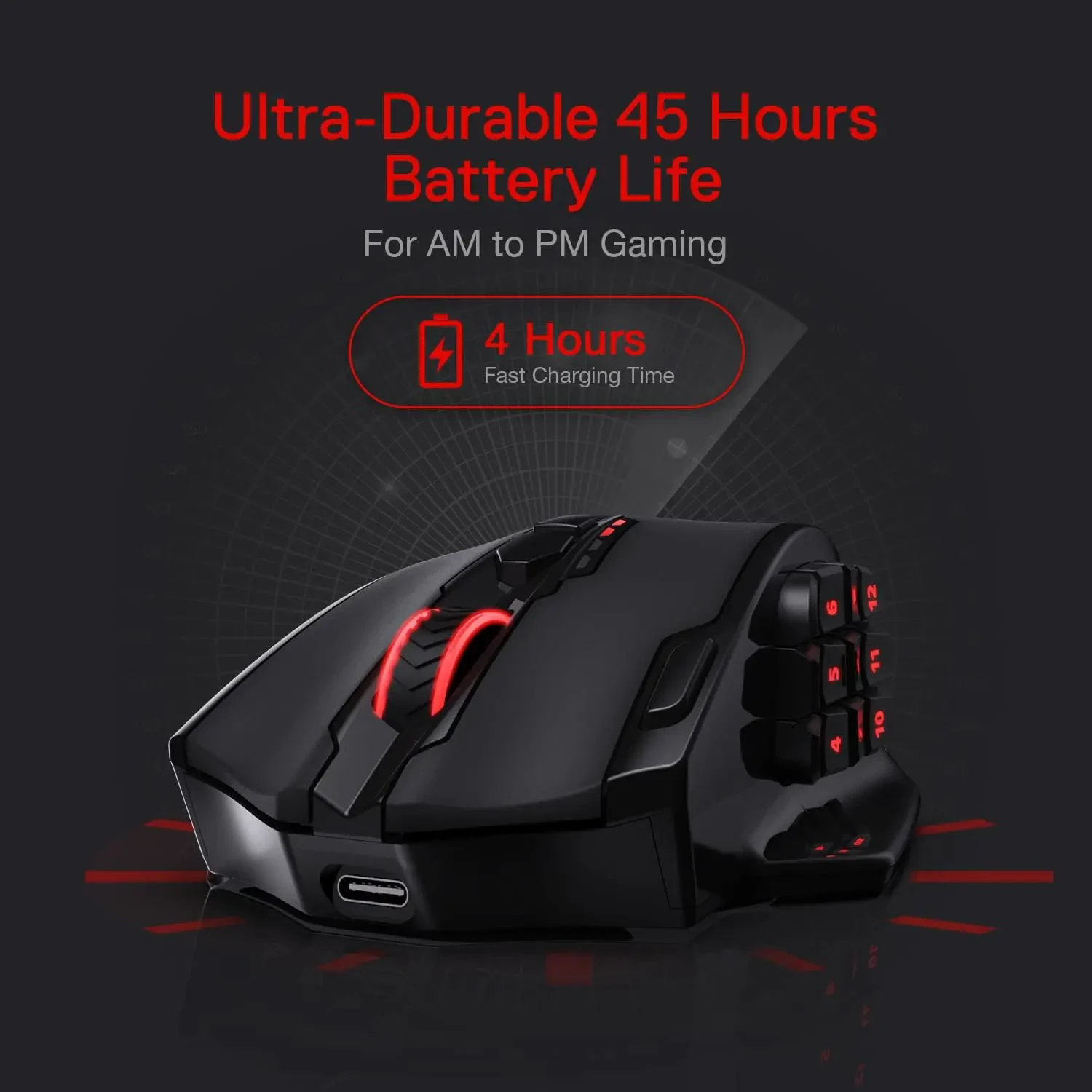 – Redragon M913 is the first Redragon wireless MMO gaming mouse with 12 programmable side buttons. The most tactical combo with wireless function plus side shortcuts aim for higher user experience.