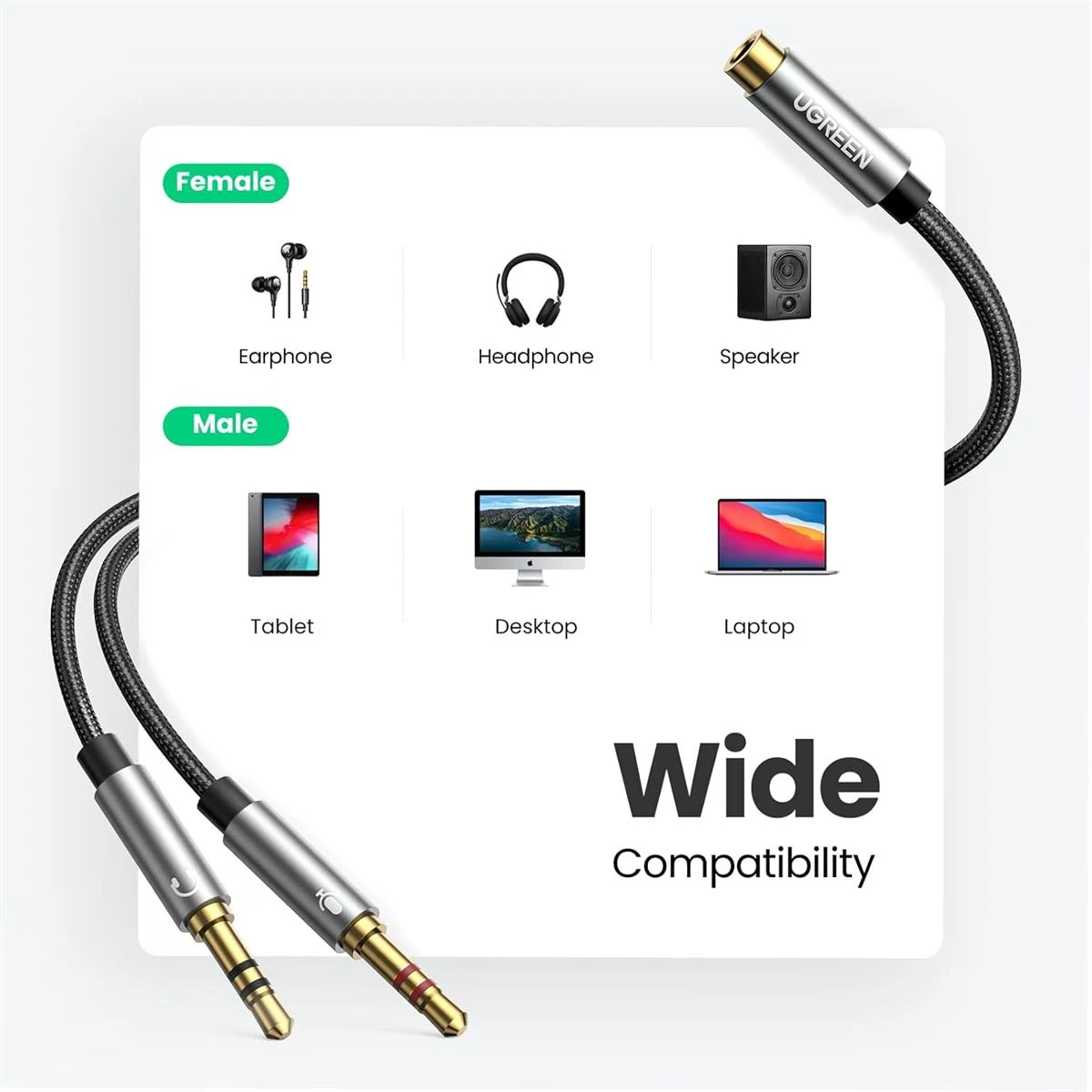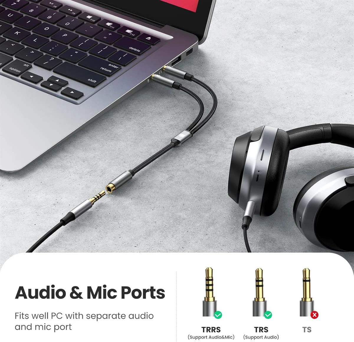 – UGREEN audio splitter for headphones splits 1 headset (support audio & microphone) jack into a separate headphone and microphone jack.