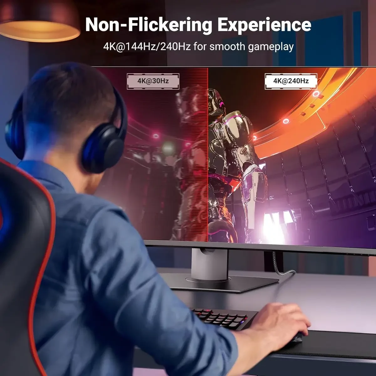 Enhanced Transmission with DisplayPort 1.4: Transmits data at speeds up to 32.4Gbps and 240Hz. Guarantees stable signal transmission, eliminating screen flickering. Supports HDCP2.3, variable refresh rate (VRR), and auto low latency mode (ALLM) for a smoother gaming experience. Compatible with flawless audio including eARC, DTS, and Dolby.